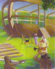 Noah went to the fields where his sons were plowing. Their names were Shem, Japheth and Ham. They listened as Noah spoke. "God has spoken to me and has told me to build an ark. It will be four hundred feet long and three stories tall. We will bring a pair of every living creature. We must begin building the ark now!" said Noah.