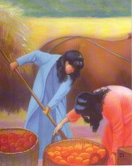 Noah, his three sons, his wife, and his three sons' wives brought apples, pears, peaches and grapes. They also brought barley, oats, wheat and hay for the animals. Then they stored clothes and fresh water to last for many days.