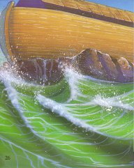 The storms raged, the wind howled and the seas frothed. The ark pitched about on enormous waves with Noah, his family and the animals safe inside. Later, God thought about Noah and the ark. The flood waters went down. The ark landed with a BUMP! It was stuck on top of a mountain called Ararat. Noah knew that they would be getting out of the ark soon. He had to find land, but how?